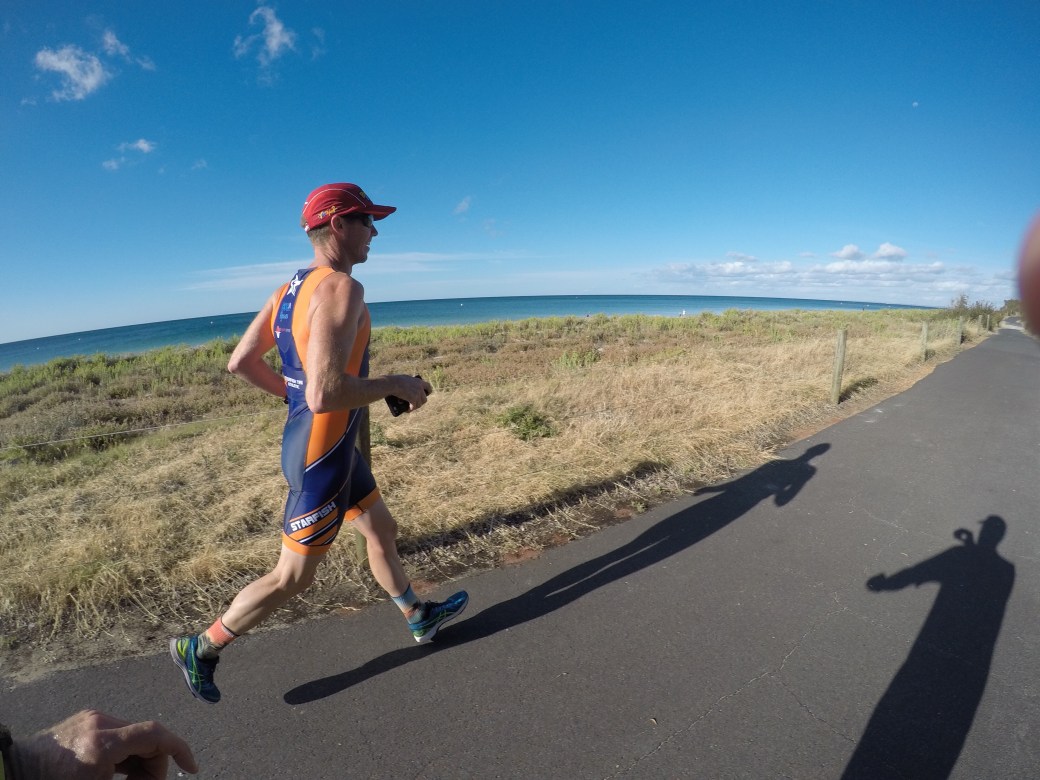 My bike ride can be summarised as follows, first lap great numbers, rising temperature, strong winds, the second lap, terrible numbers, survival mode engaged, insane temperatures and absolutely no wind! I rolled into T2, never have I been so happy to get off the bike. I walked, because that is literally all I could manage with the cramping preventing any other movement. I passed an athlete lying on the grass vomiting profusely, I took the time to alert medical support and continued into the shade of the tent. The heat at this point was intense and zapping everything it could from me! I collapsed into the plastic chairs in T2 and poured cold water down the back of my neck and just sat there. At this point I couldn’t contemplate the marathon, I just needed to cool down. The volunteers in here were amazing, running around looking after everyone, with ice, cold water and sunscreen. It took a fellow competitor to convince me to put my running shoes on and head out to start, 42.2km wasnt going to get any shorter by sitting in the tent. 1 step at a time was the discussion we had. With that I headed out of the tent to get hosed down before starting the epic task of trudging 42.2km.
