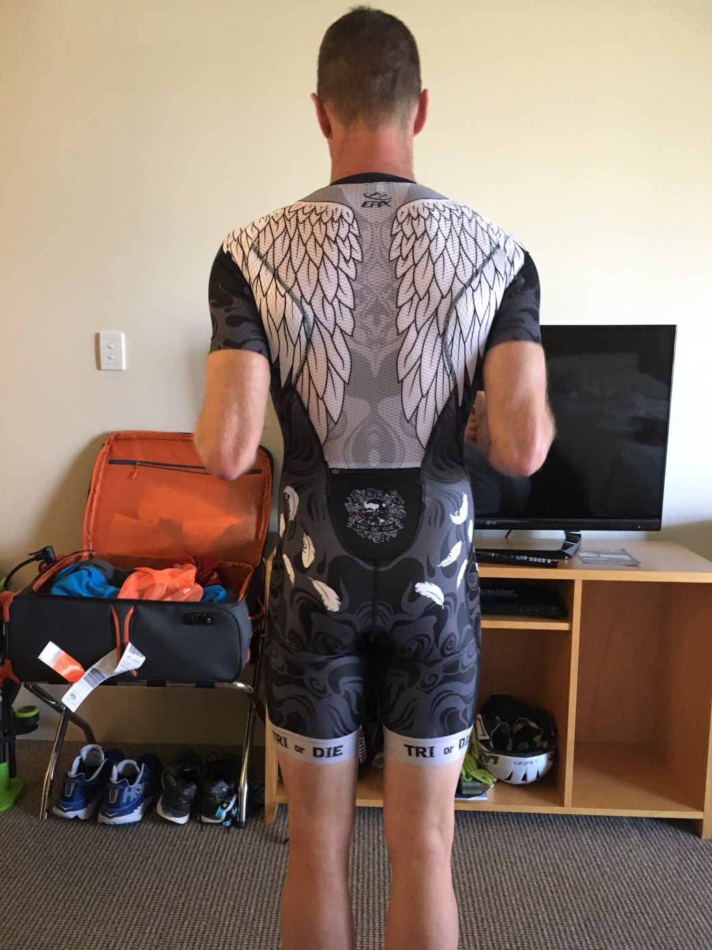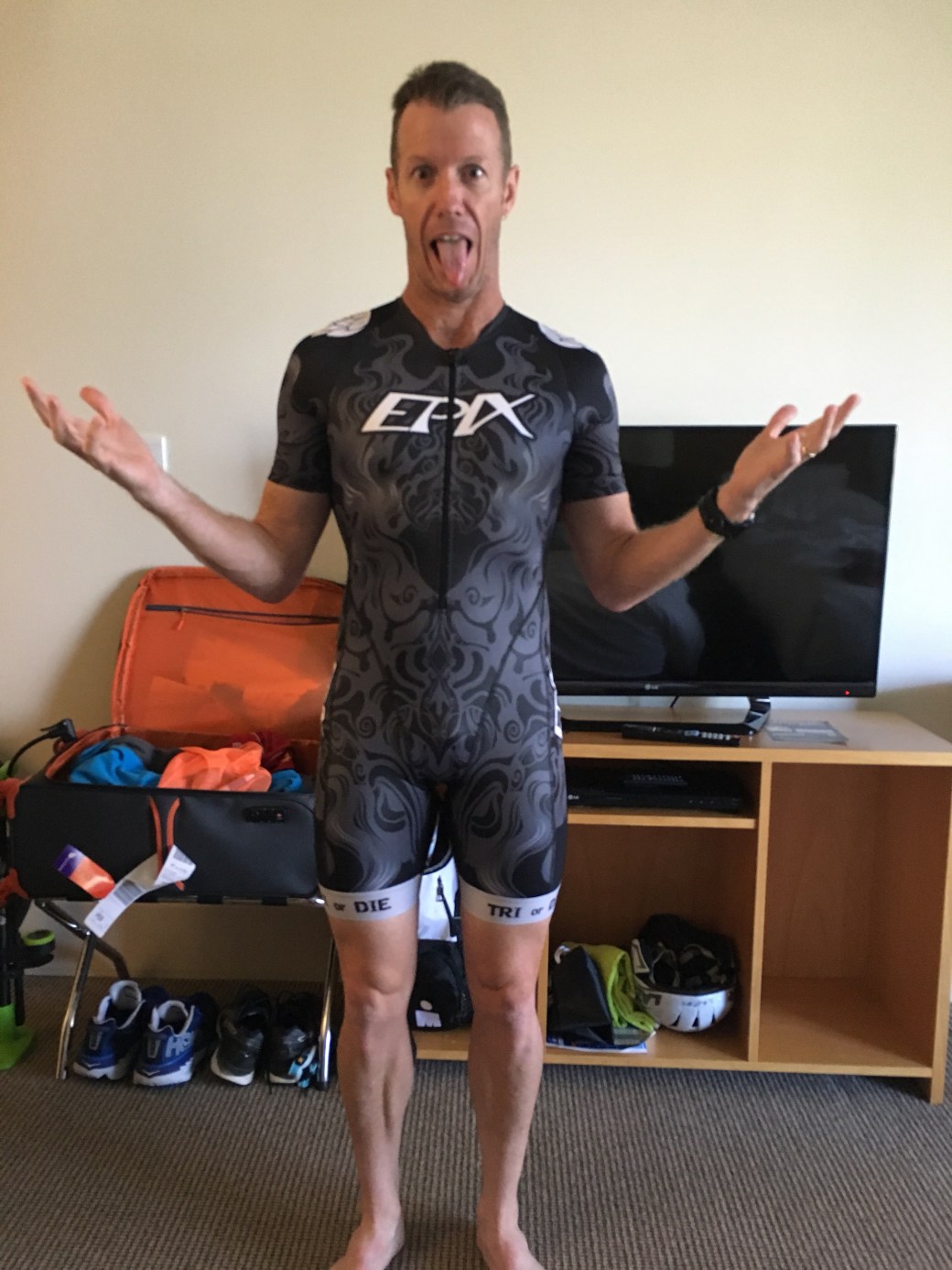 About 2pm in the afternoon following a little rest/sleep, I raced down to the expo and purchased a new tri-suit from Epix. It was rather an amusing experience, having my wife, Mel, on a video call and showing her the options. Finally settling on one that felt comfortable and met the wife’s approval.